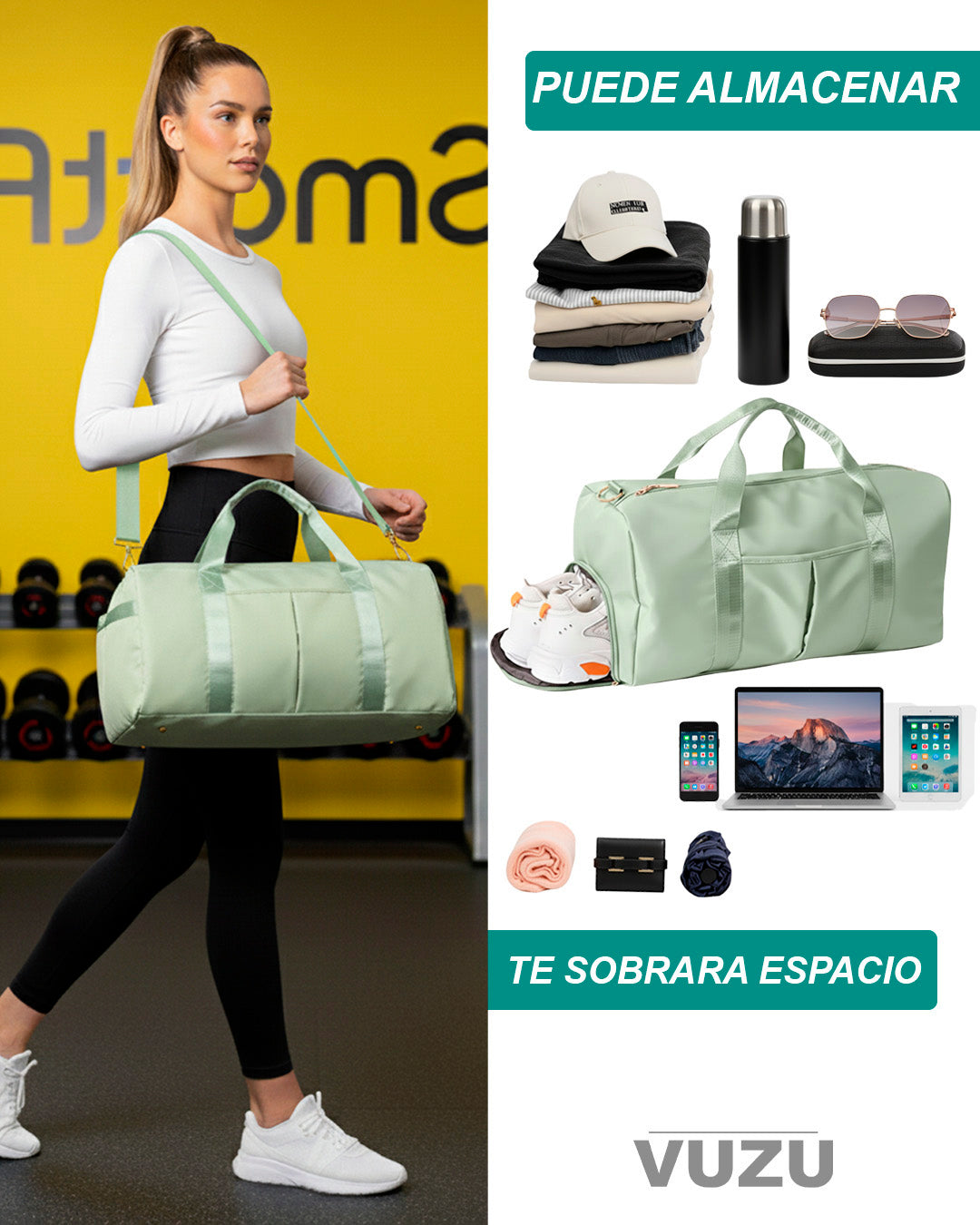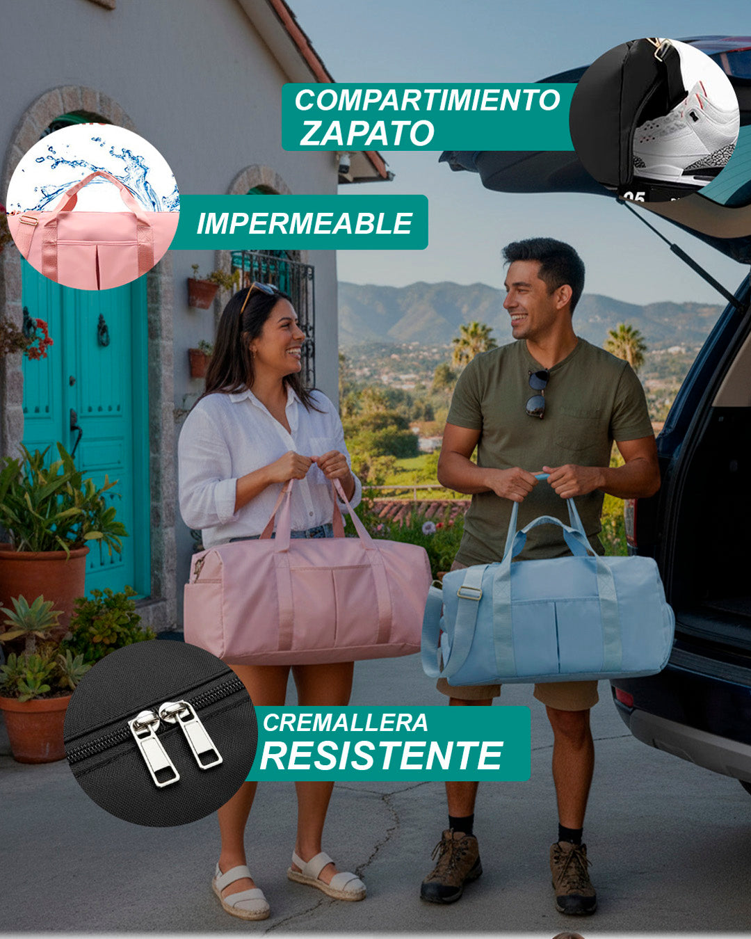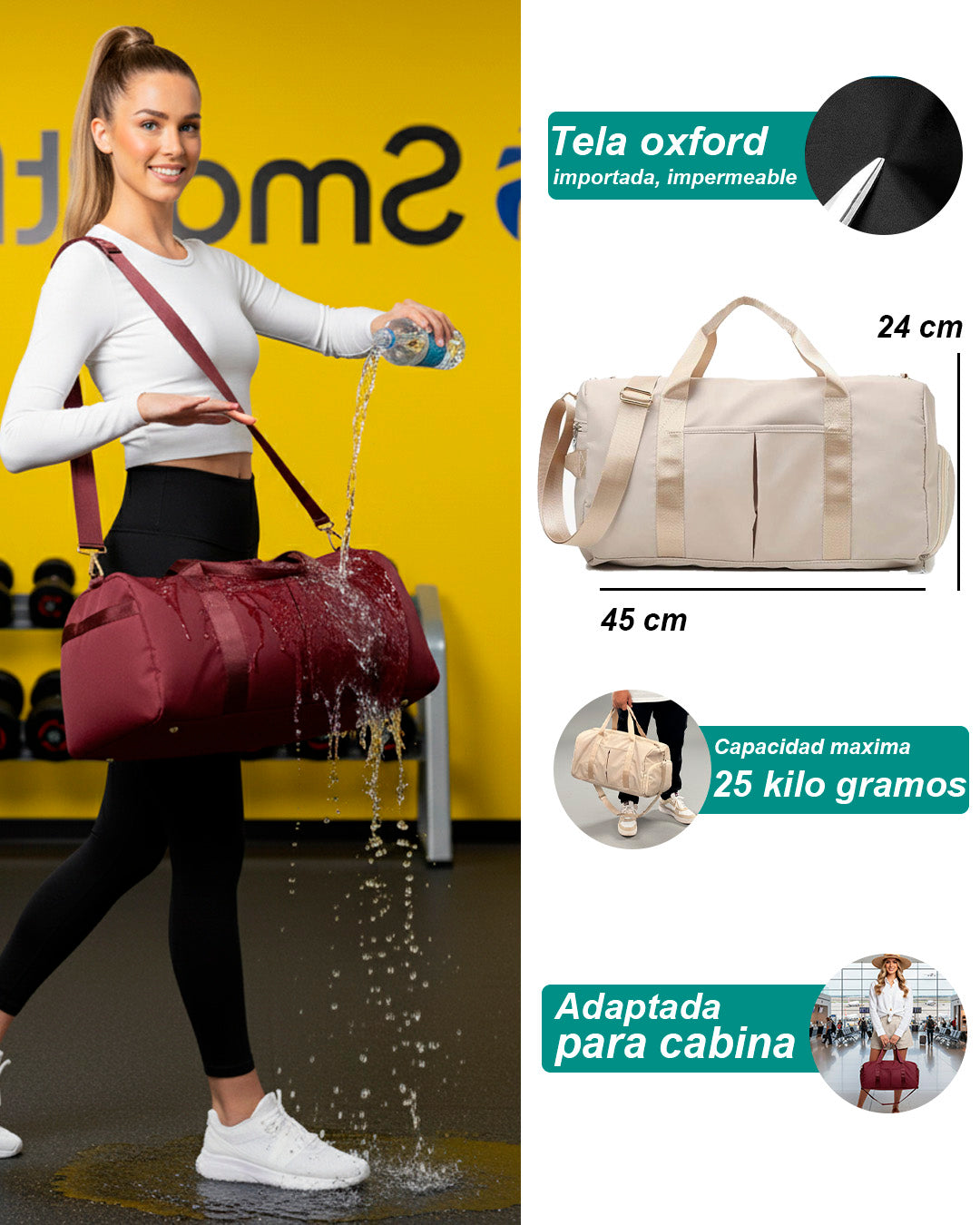 Incluye bolsillo impermeable para ropa húmeda, compartimento para zapatos y bolsillos adicionales para organizar tus cosas.